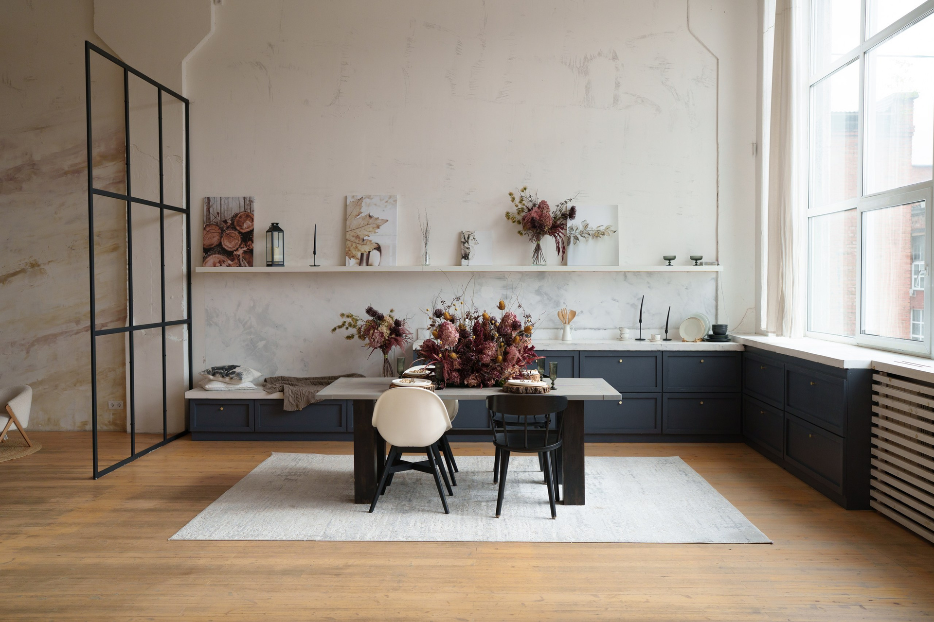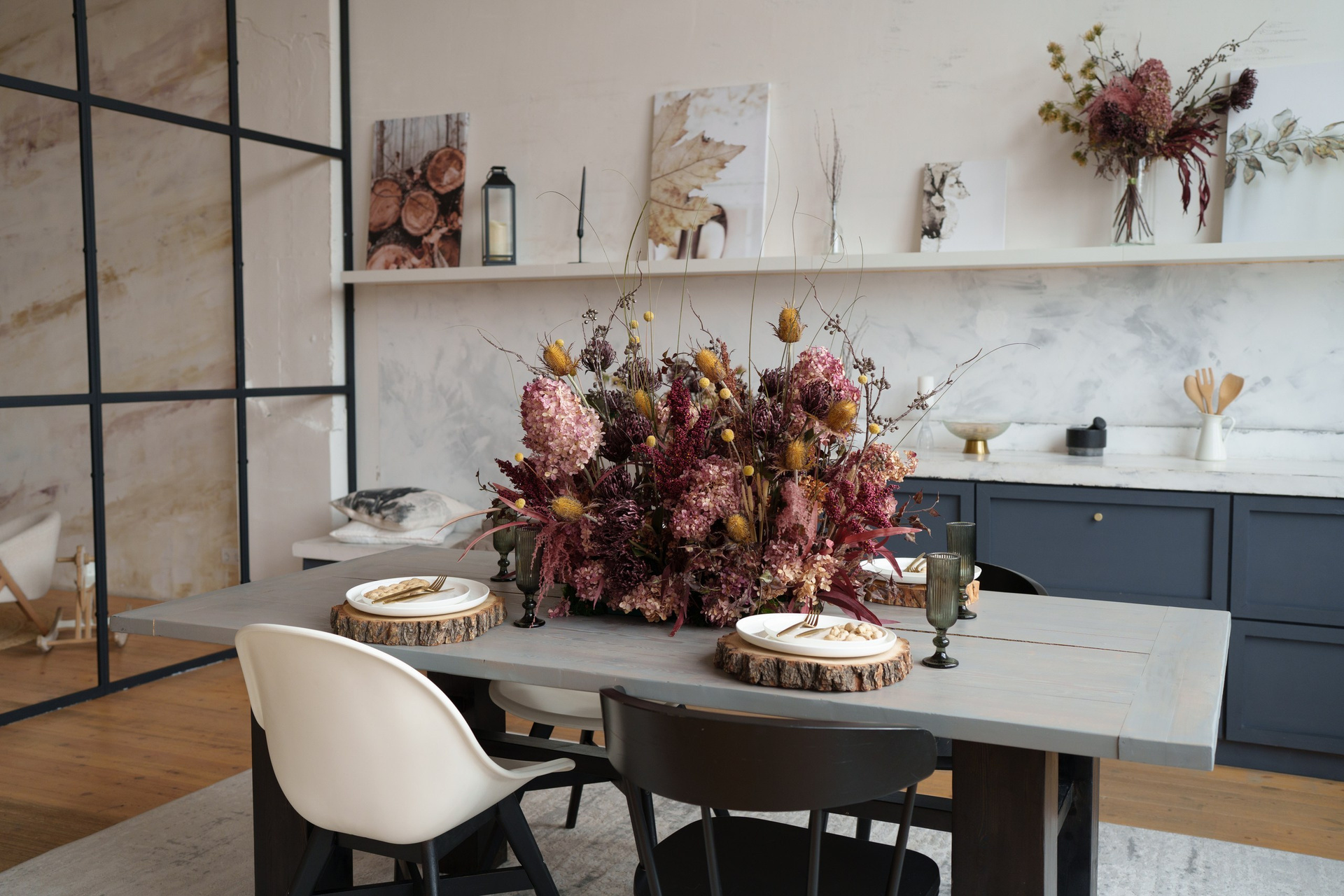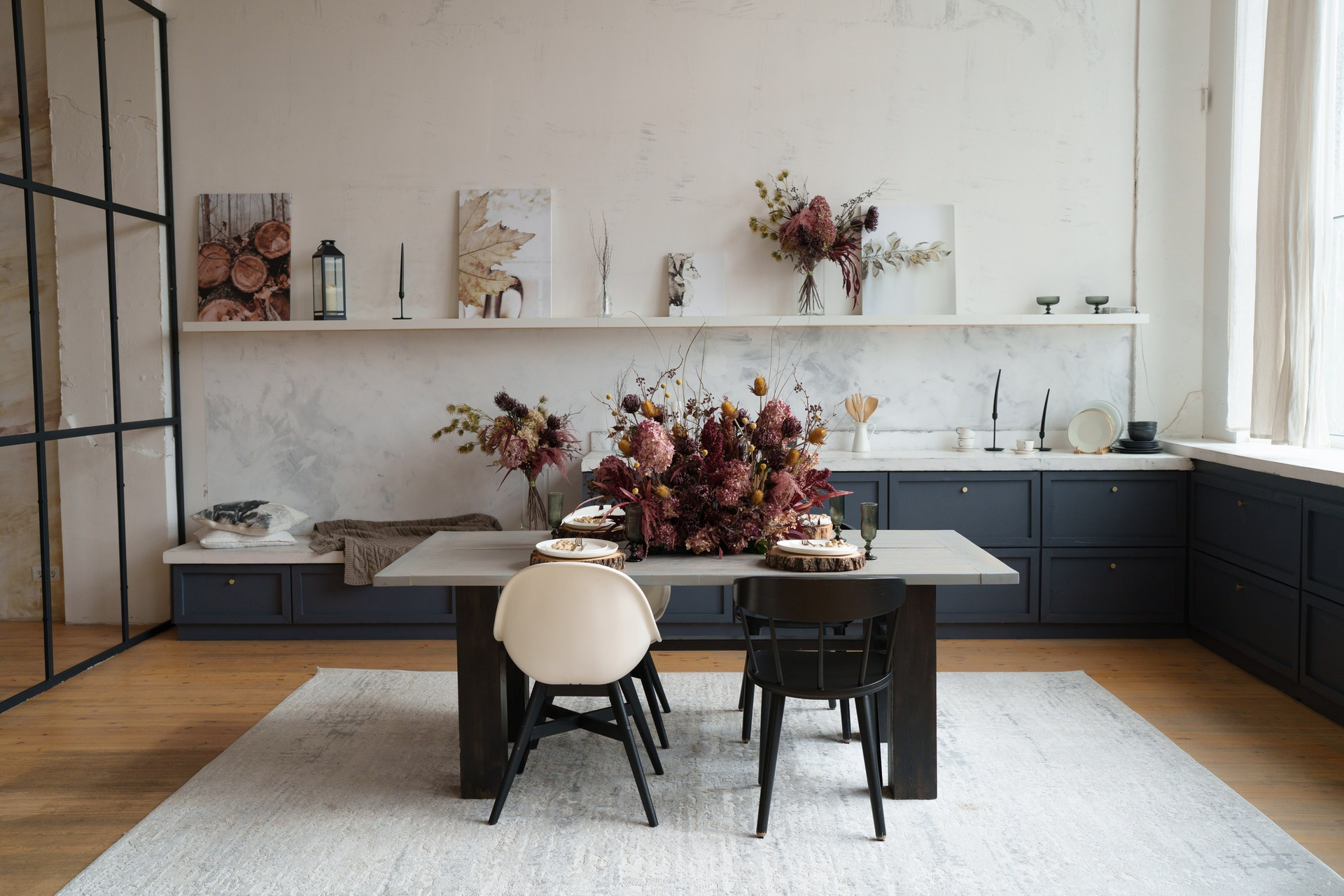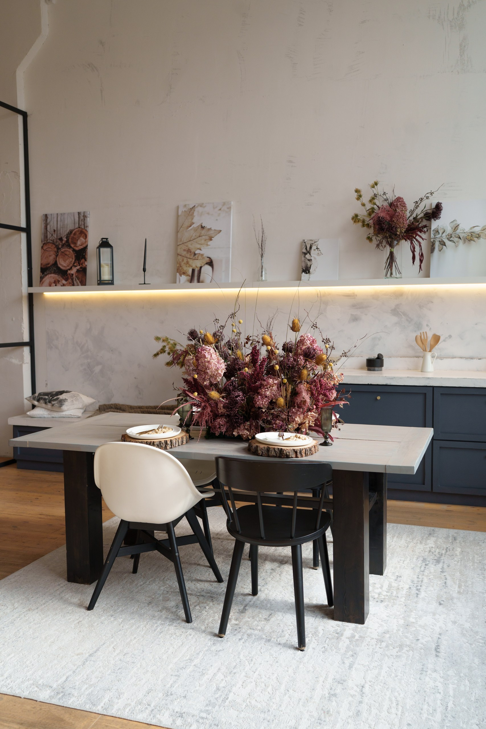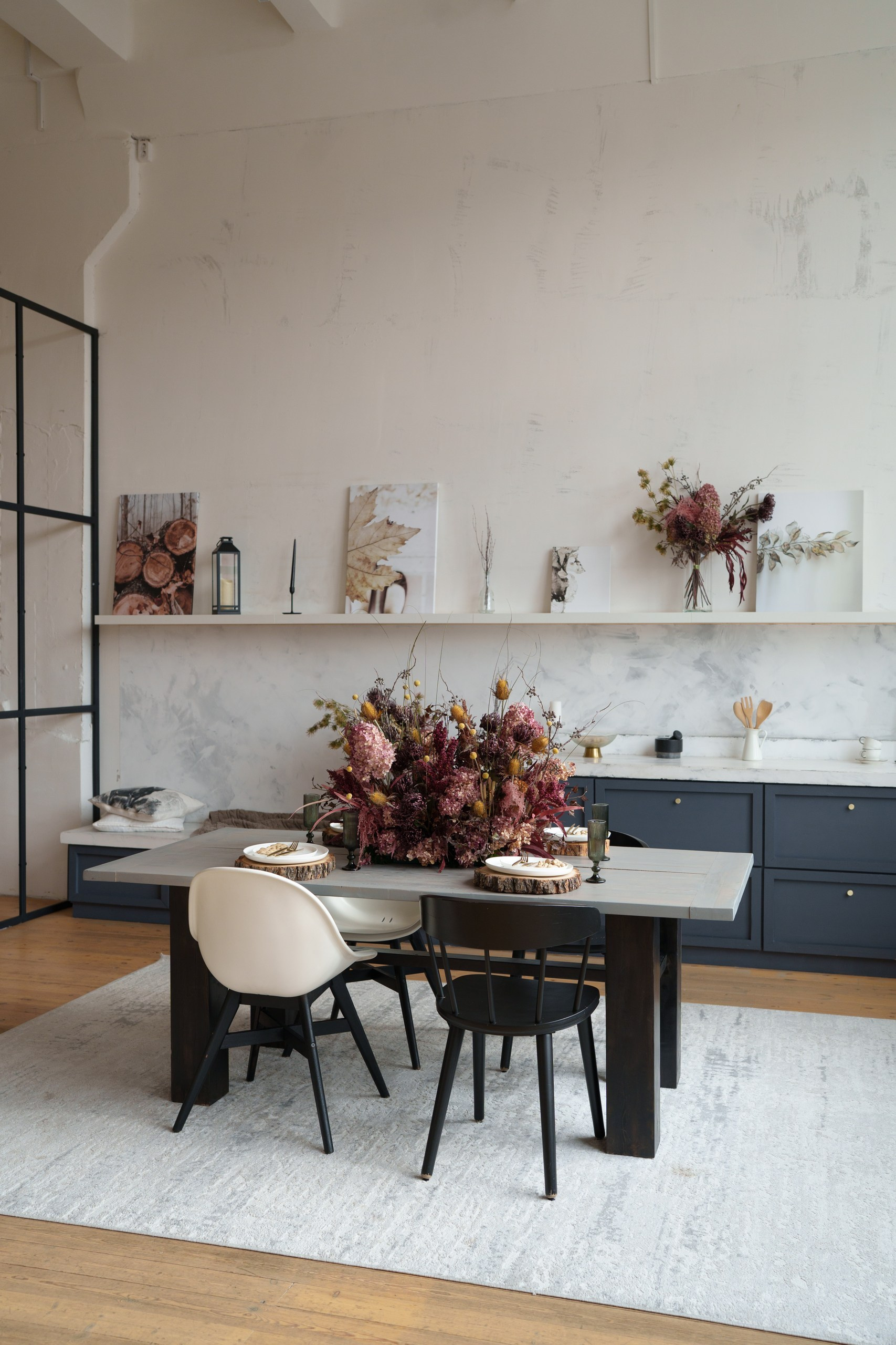 - Интерьерная кухня с прямоугольным столом, сервированным на 4 персоны;