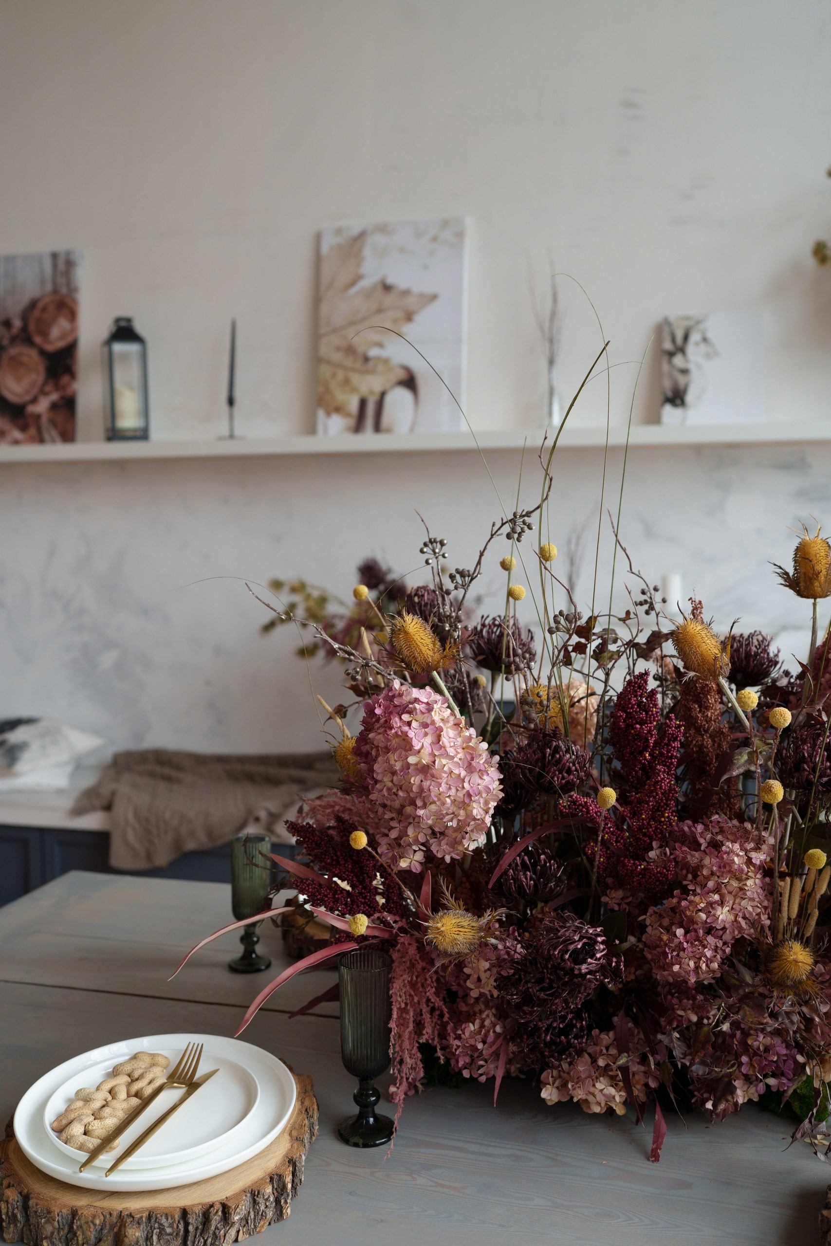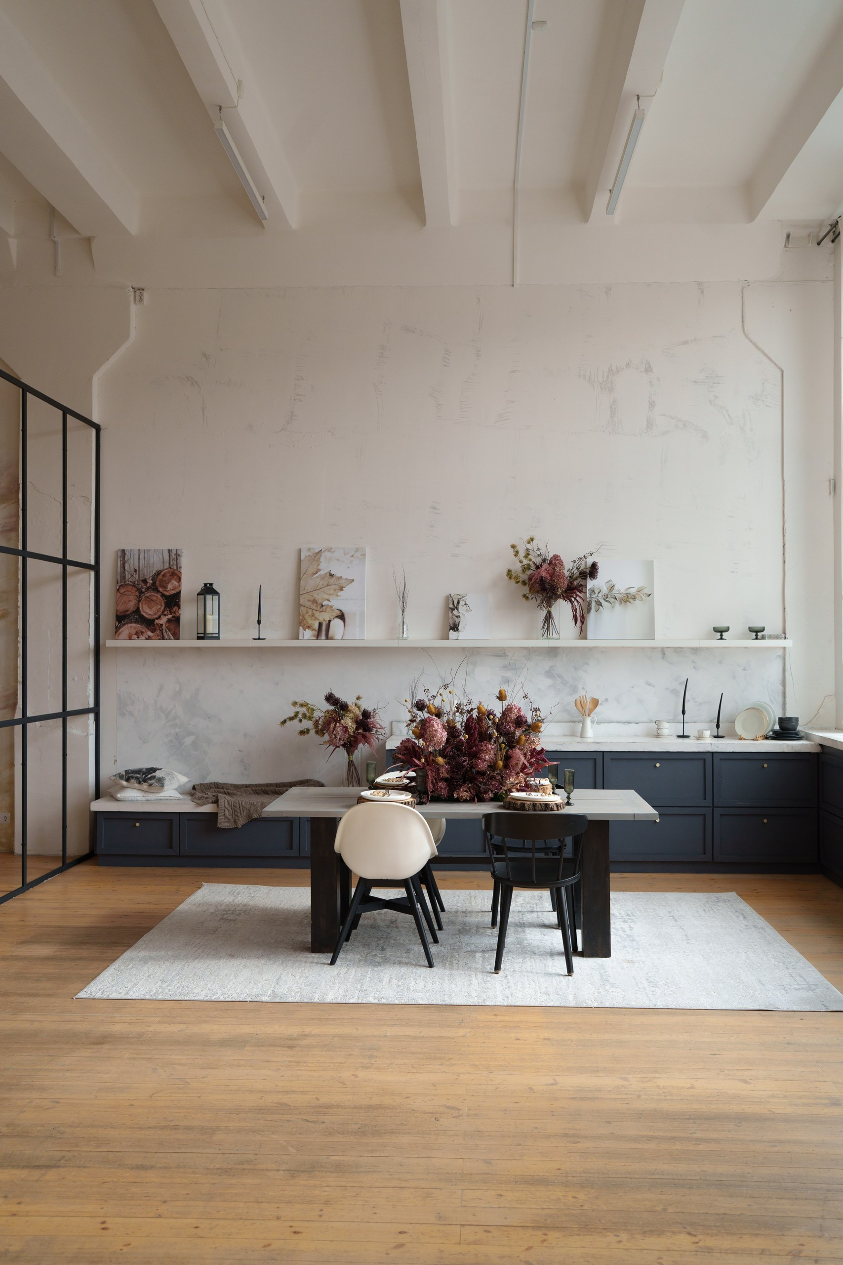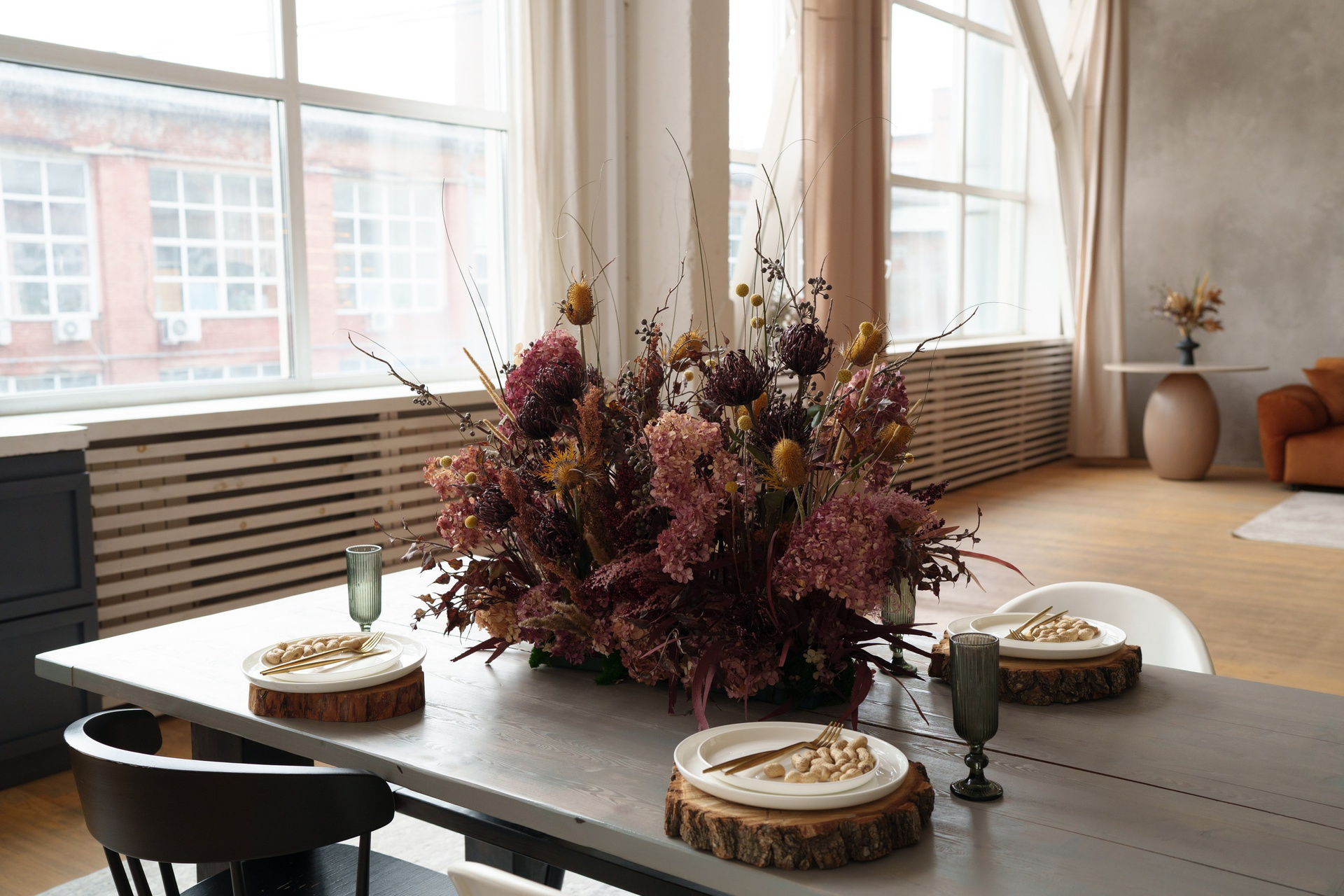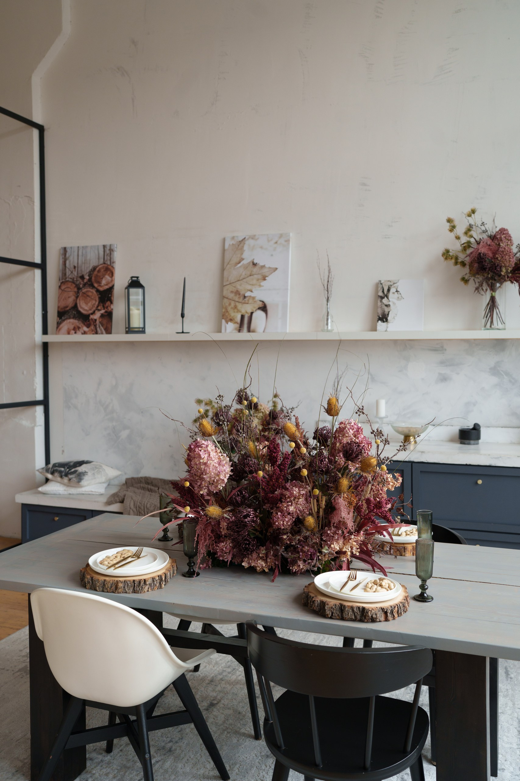 - Интерьерная кухня с прямоугольным столом, сервированным на 4 персоны;