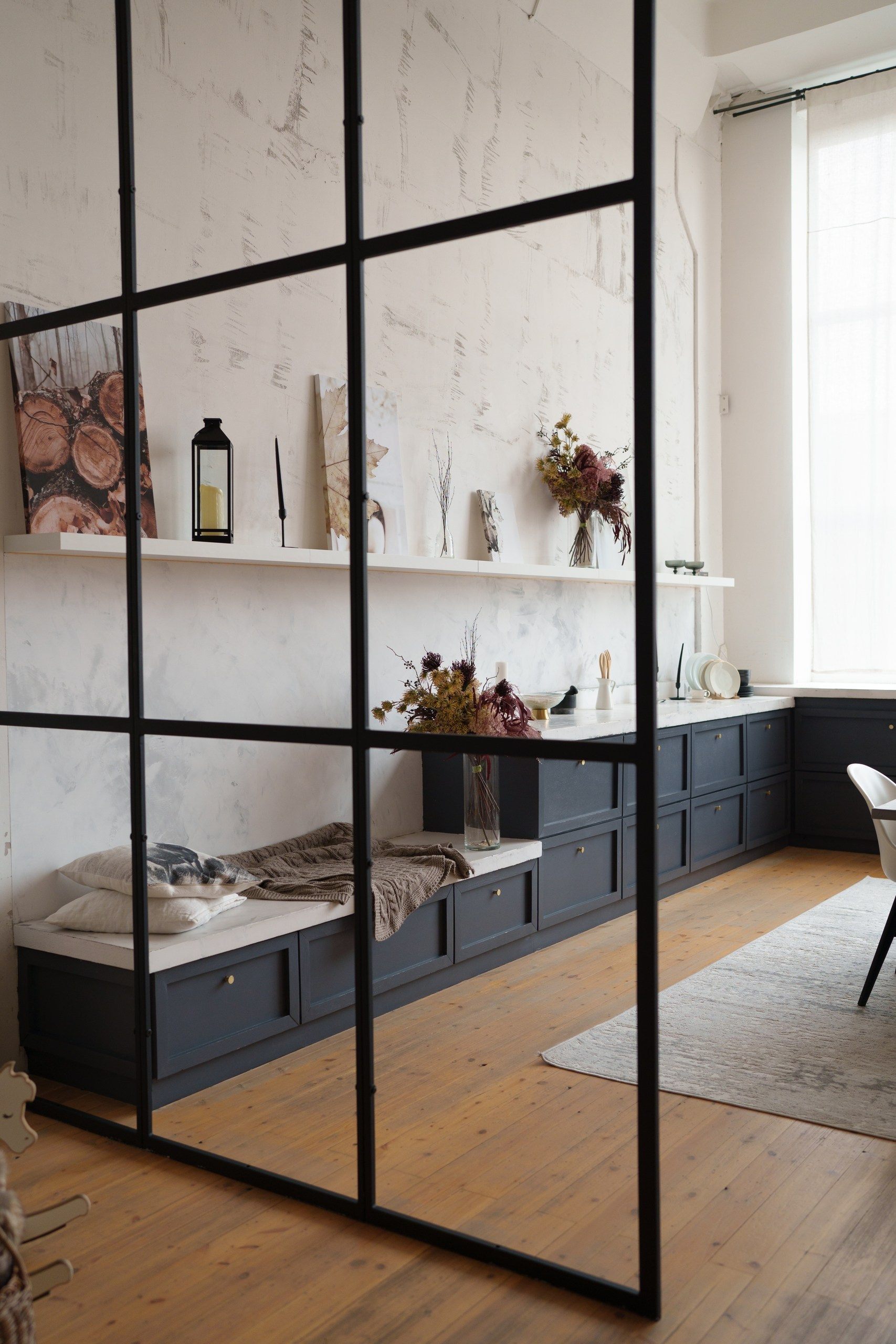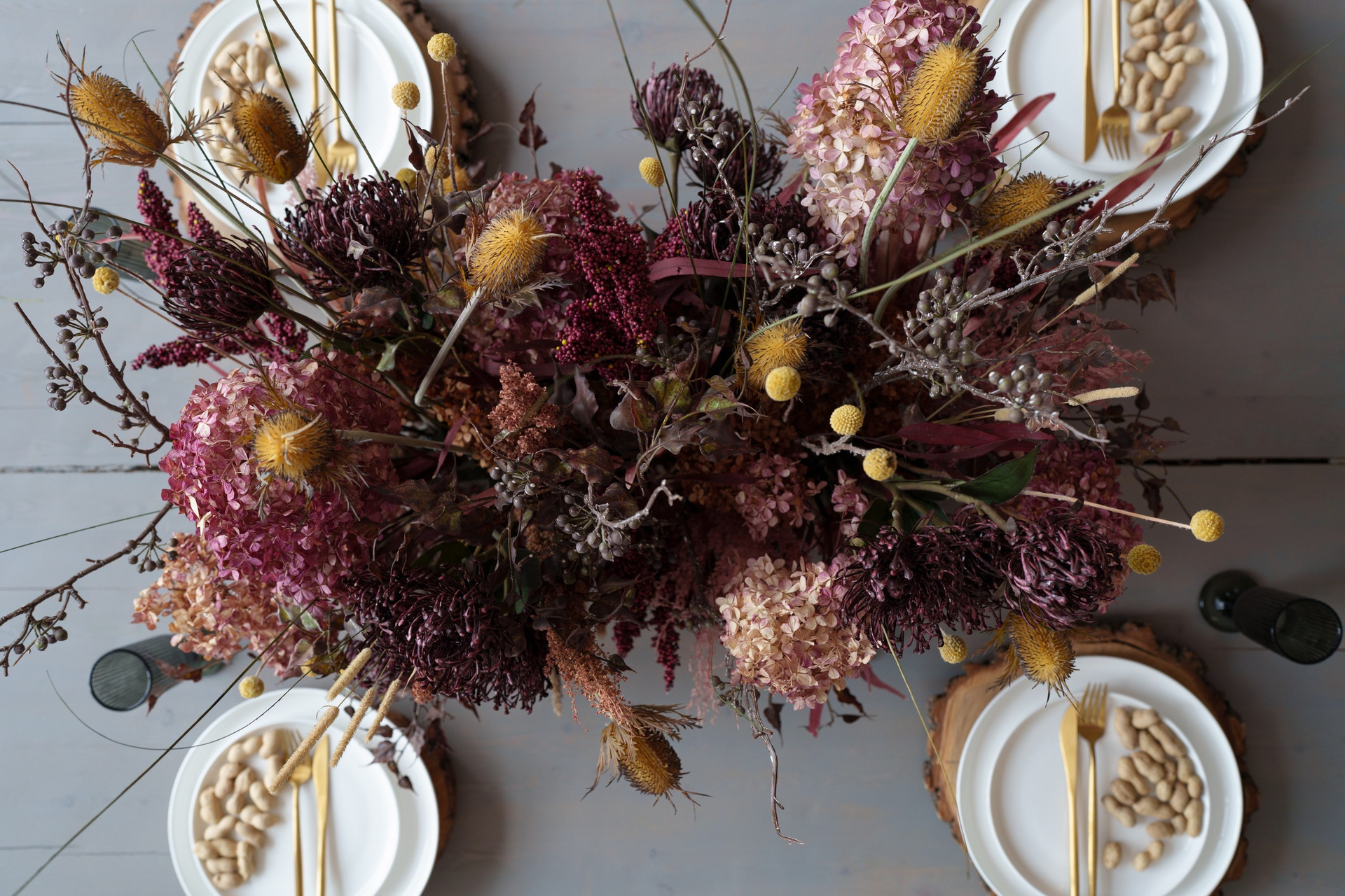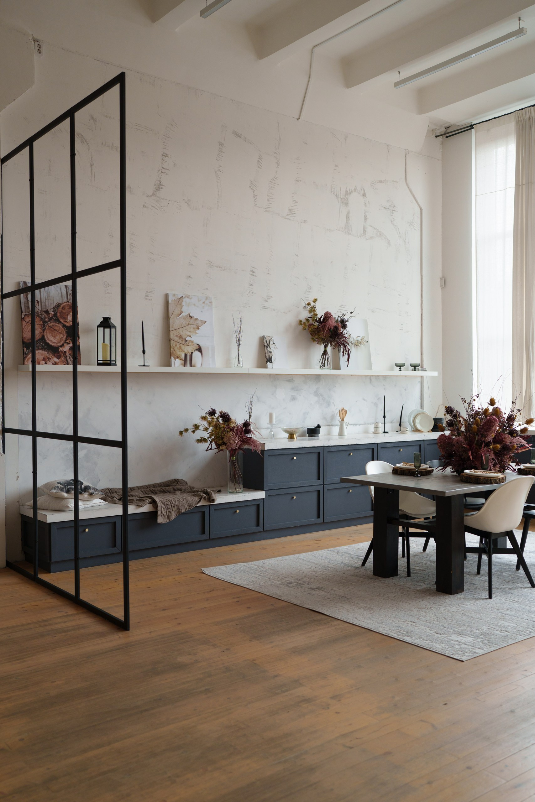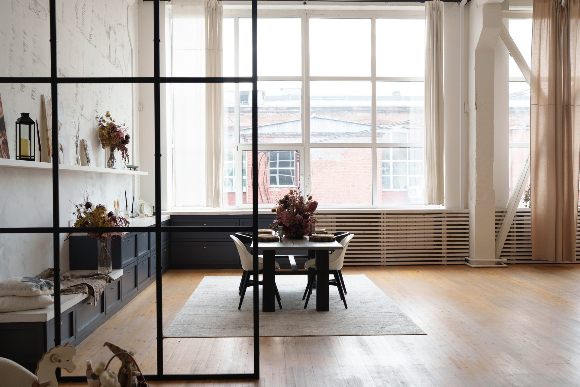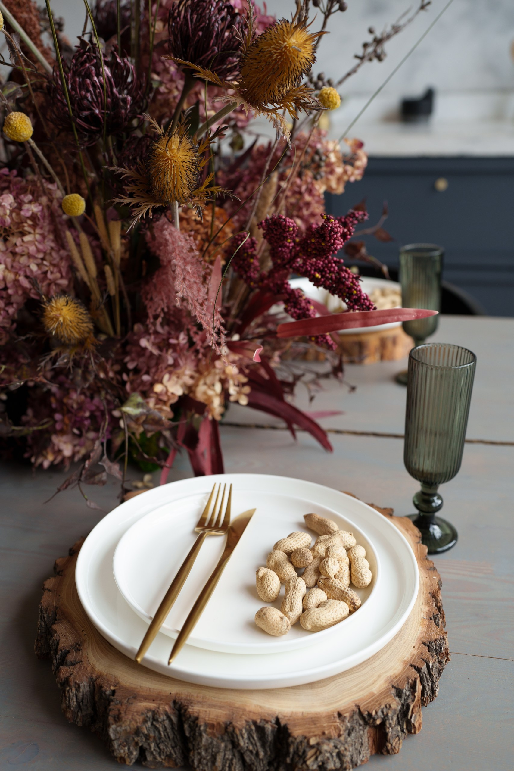 - Интерьерная кухня с прямоугольным столом, сервированным на 4 персоны;