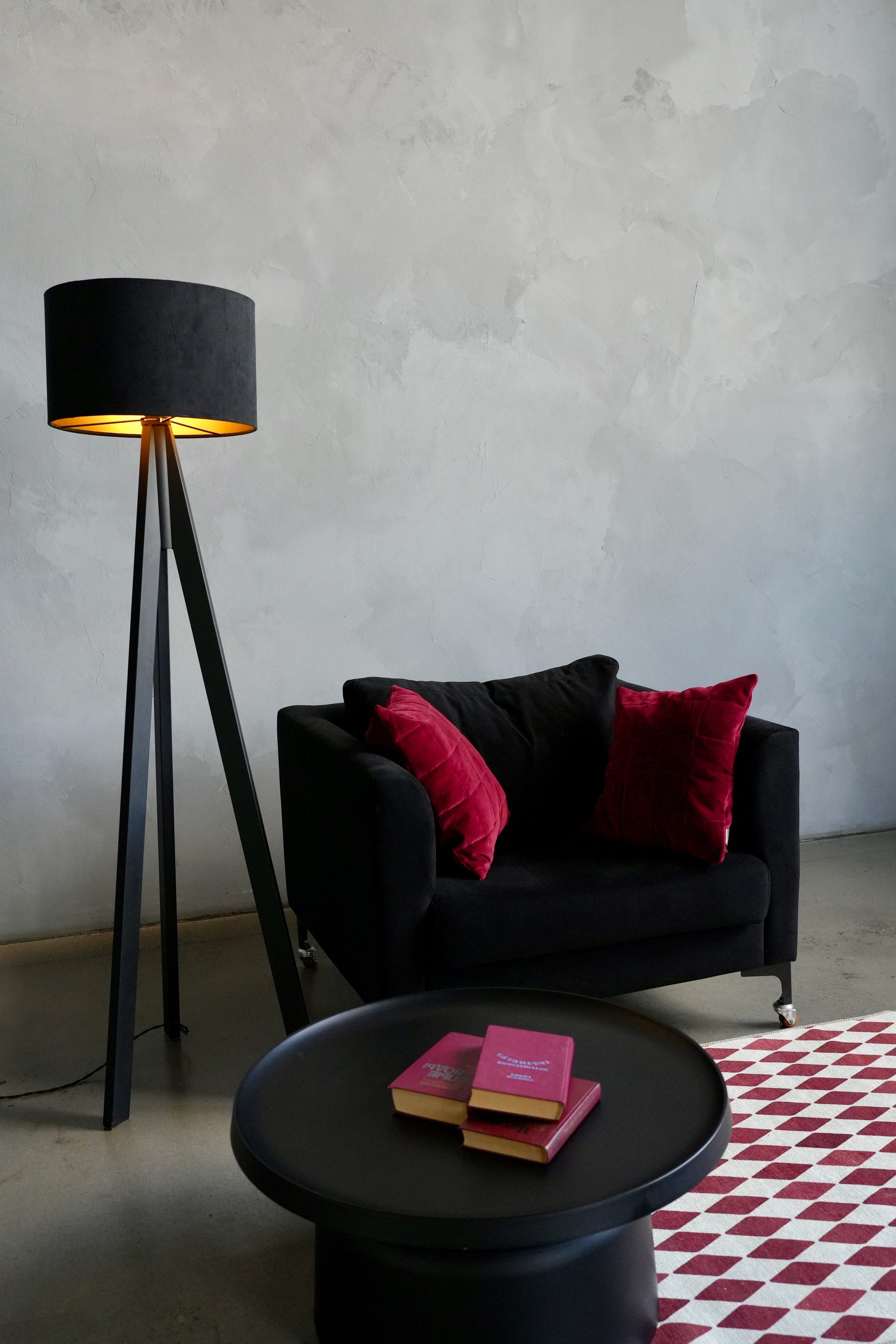 Элегантное передвижное кресло, черный торшер, журнальный столик.